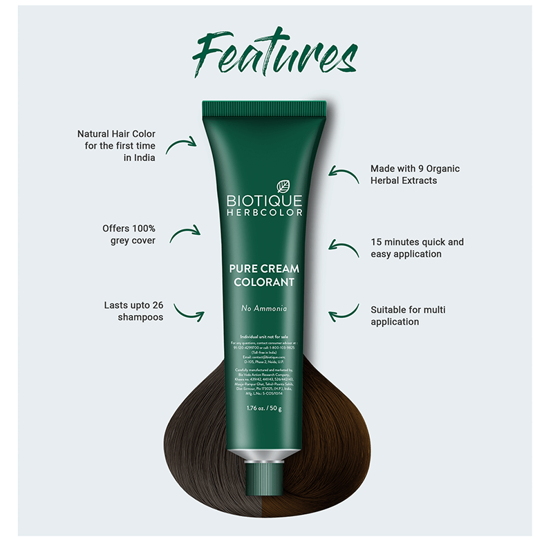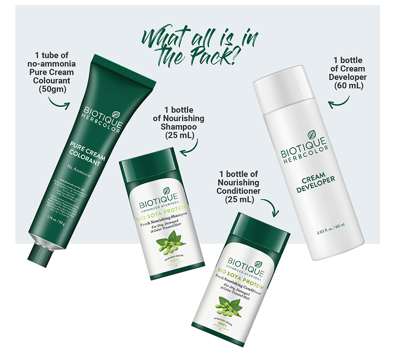 Biotique Herbcolor Hair Color kit contains pure Cream Colourant (50g), Cream Developer (60mL), Nourishing Conditioner (25mL) (FREE SAMPLE), Nourishing Shampoo (25mL) (FREE SAMPLE), 1 Pair of Gloves, Usage Instructions Leaflet, Herbal Enriched Recipe (For External Use Only).  Pure & Preservative-Free Organic Ingredients. Dermatologist Safety Tested.