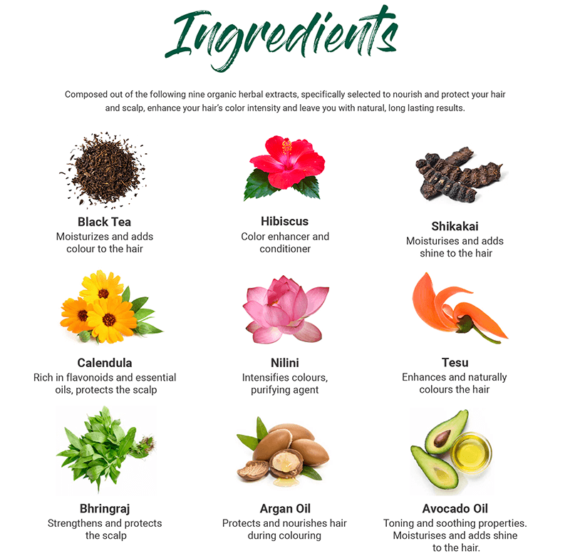 • BHRINGRAJ: Bhringraj is an ancient herb rich in proteins, used for centuries to prevent hair loss and premature greying. Inhibits dandruff and helps keep hair shining with health.