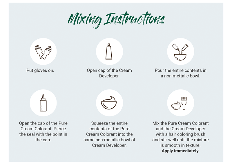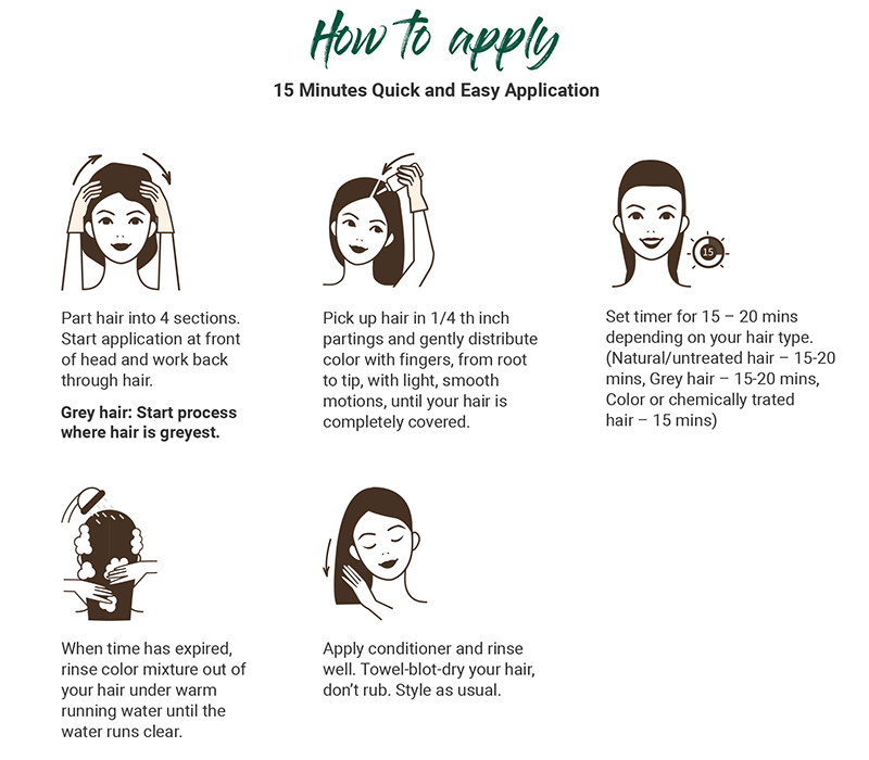 Part Hair into 4 sections- start application at front of head and work back through hair. Pick up hair in 1/4th inch partings and gently distribute color with fingers. Set timer for 15-20mins, after this rinse color mixture out of your hair under warm water until the water runs clear. Apply conditioner and rinse well
