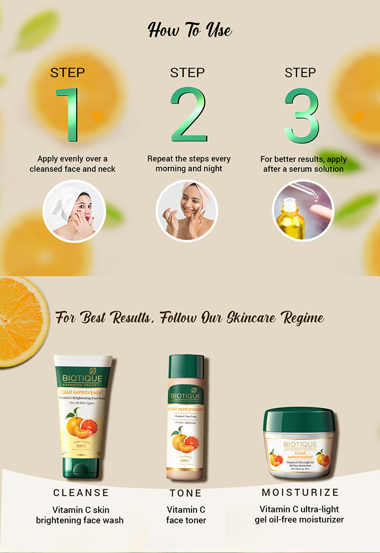 Biotique Clear Improvement Vitamin C Moisturizer can be evenly applied to cleansed face and neck morning and night. Alone or under makeup.