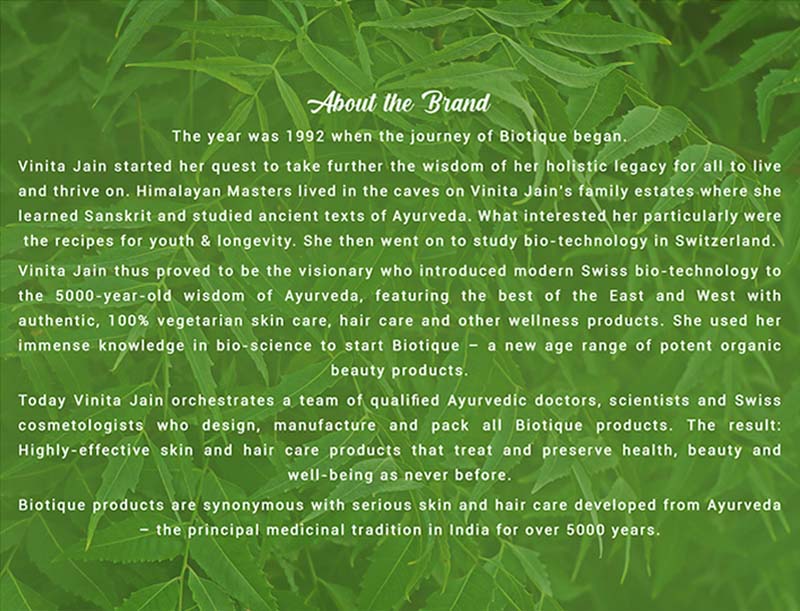 With our effective anti-dandruff shampoo for women, say goodbye to flaky hair and hello to confidence. The power of Neem, a traditional herbal medicine well known for its anti-dandruff capabilities, is added to this shampoo specifically for women looking for an efficient cure. A solution that not only fights dandruff but also nourishes your scalp is the result of Biotique's experience in skincare and hair care.