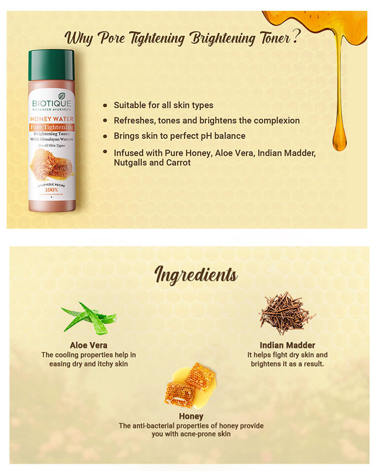 Since it contains natural ingredients, Biotique Honey Water Pore Tightening Brightening Toner is safe and best for all skin type.