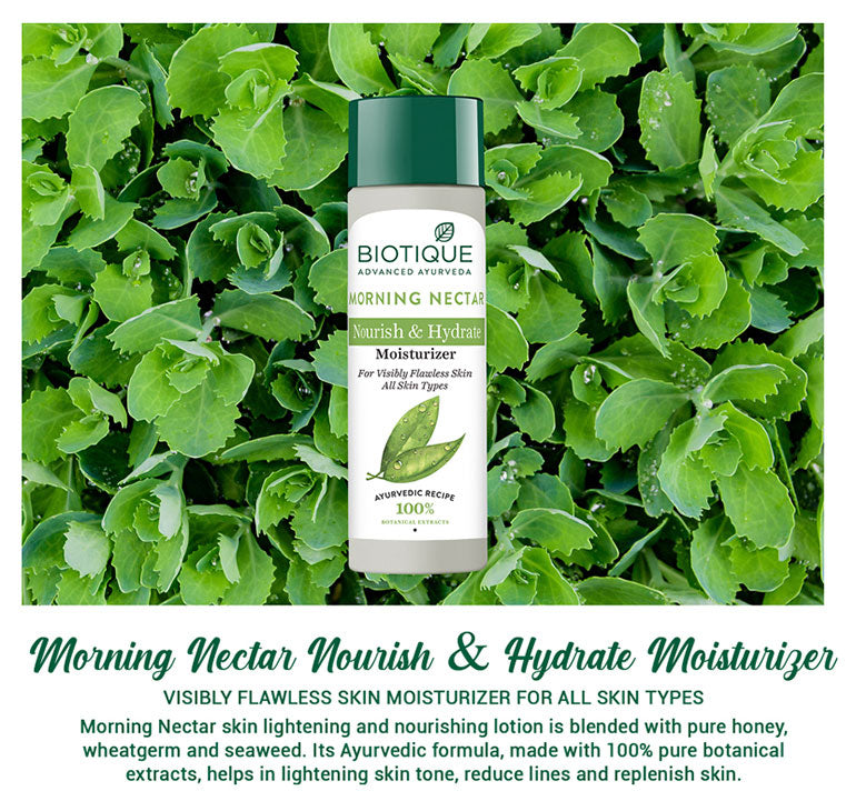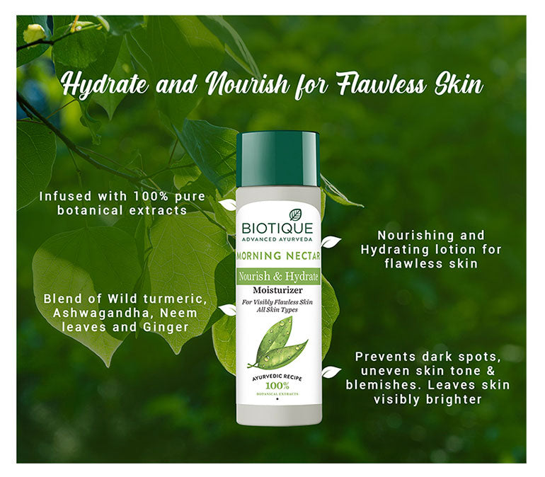 Biotique Morning Nector Nourish & Hydrate Moisturizer contains 100% natural botanical extracts.