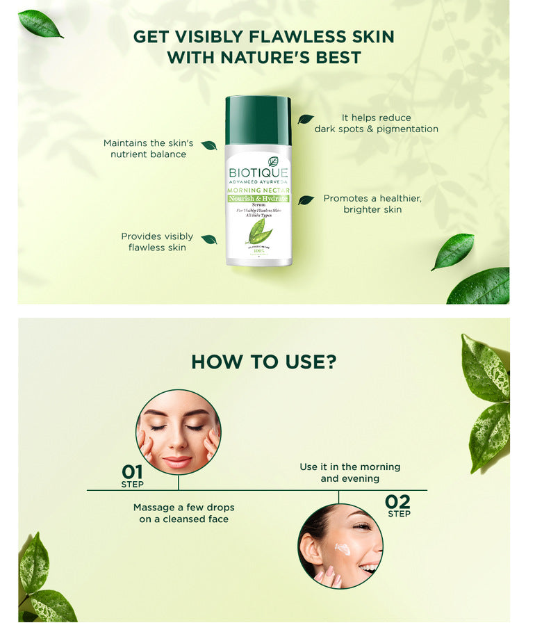 Biotique Morning Nectar Nourishing & Hydrating Serum can be used before moisturizer. Massage a few drops into cleansed skin.